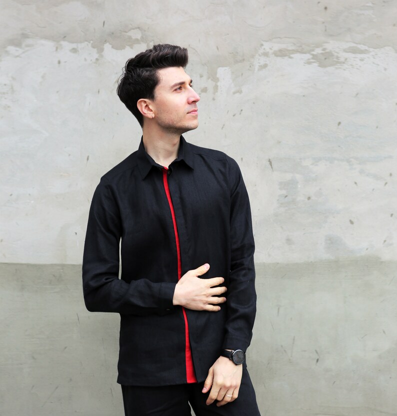Black Mens Linen Shirt Summer Shirt Dress Shirt Band Collar Shirt Gift For Him Linen Clothes Minimal Black And Red Shirt Unique Design Shirt
