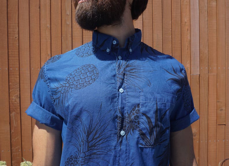 Men S Hawaiian Indigo Overdyed Button Up Shirt Summer Aloha Shirt Pineapple Floral Print Tropical Tiki Short Sleeve Cotton Shirt Blue