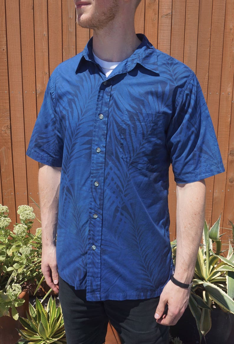 Men S Hawaiian Indigo Overdyed Button Up Shirt Summer Aloha Shirt Palm Floral Print Tropical Tiki Short Sleeve Cotton Small Medium Blue