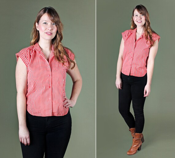 Vintage Striped Summer Button Up Shirt Woven Red White Short Sleeve Cotton 1980 S 80 S Top Blouse Collared Size Medium Or Slim Large
