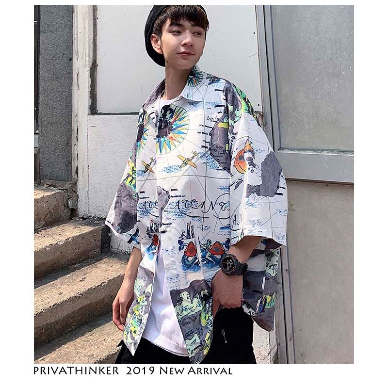 Men Streetwear Hawaiian Shirt 2019 Summer Mens Graffiti Hip Hop Oversized Shirts Regular Fit Korean Button Up Shirt