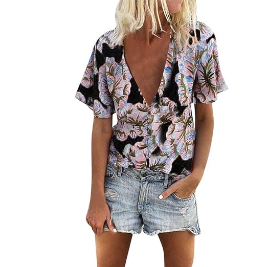 Women Casual Tops Deep V Neck Boho Floral Shirt Short Sleeve Summer