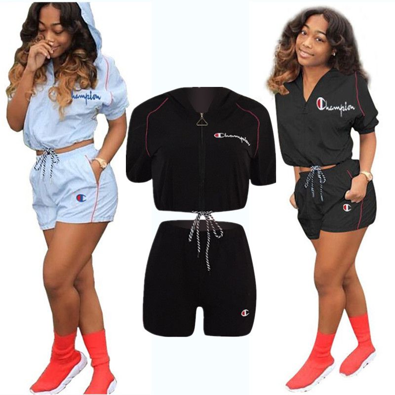 Champions Summer Shorts Suit Women Tracksuit Hooded Short Sleeve T Shirt Crop Top Shorts 2 Piece Sportswear Fashipn Sports Suit A32002
